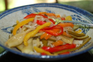 - Remove the stem and seeds from the bell peppers and thinly slice them lengthwise and transfer to the mixing bowl.